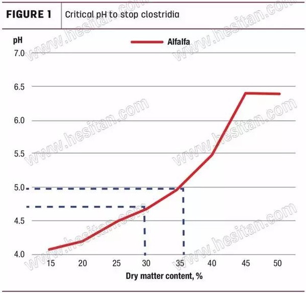 苜蓿青貯中的梭菌在收獲時易于控制,干物質(zhì)含量為35%或更高,且不產(chǎn)生大量的丁酸。該圖顯示,當(dāng)紫花苜??菸?5%的干物質(zhì)(或更大),一個關(guān)鍵的pH值達到5.0,以防止梭菌生長。在較高水分條件下,防止梭菌的pH值明顯較低。隨著梭菌分解產(chǎn)生氨態(tài)氮,從而提高pH值,允許梭菌繼續(xù)生長,這個問題繼續(xù)惡化。